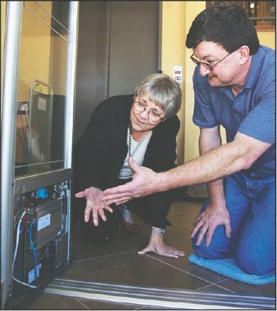 Jim Warrington of Bibliotheca explains to Jackie Thomas, director of the Poplar Bluff Public Library, how the new RFID security gates work. The Poplar Bluff Public Library is the first in the nation to recieve Bibliotheca’s latest model of RFID gates, which are designed and manufactured in Switzerland.