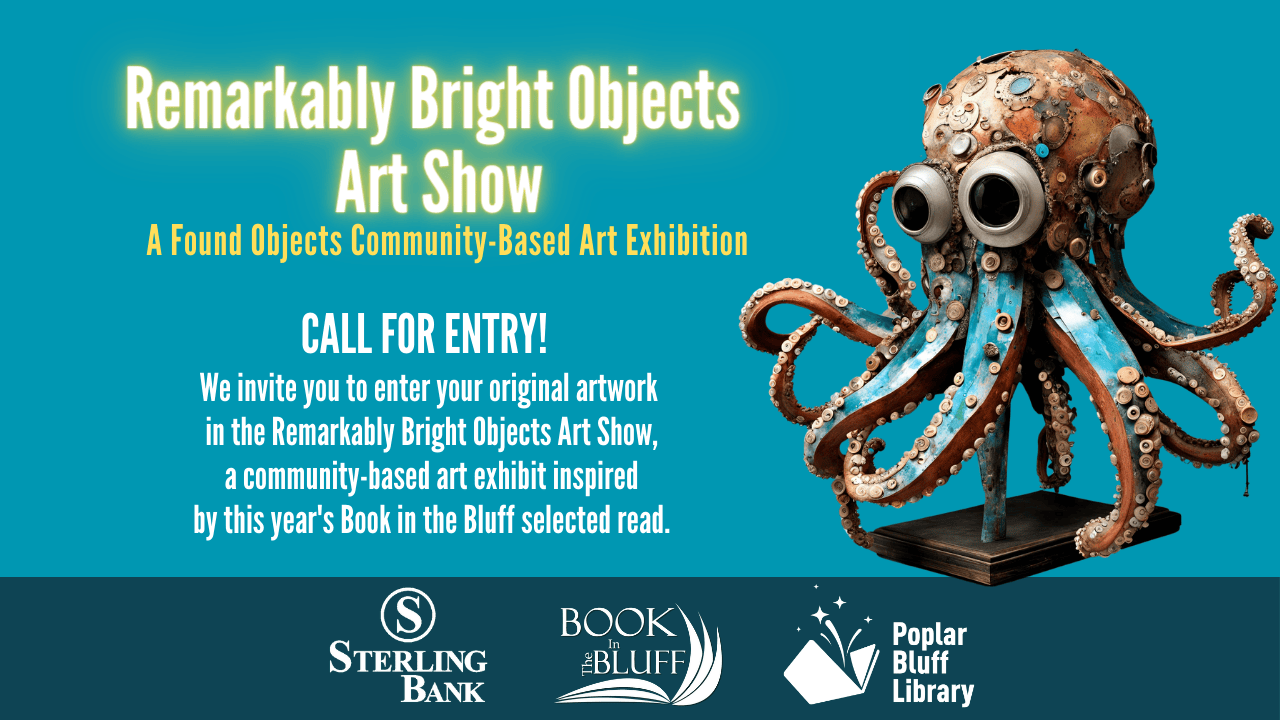 The Poplar Bluff Library invites you to submit a piece of artwork for our upcoming art exhibition Remarkably Bright Objects. This exhibition coincides with the library's community read program, The Book in the Bluff. This year's selected title is Remarkably Bright Creatures by Shelby Van Pelt. "Lost and found" is among the book's themes and motifs and the inspiration behind the found objects art exhibition. Although participation in The Book in the Bluff program is always encouraged, it's not necessary for submitting an artwork to this call for entry.