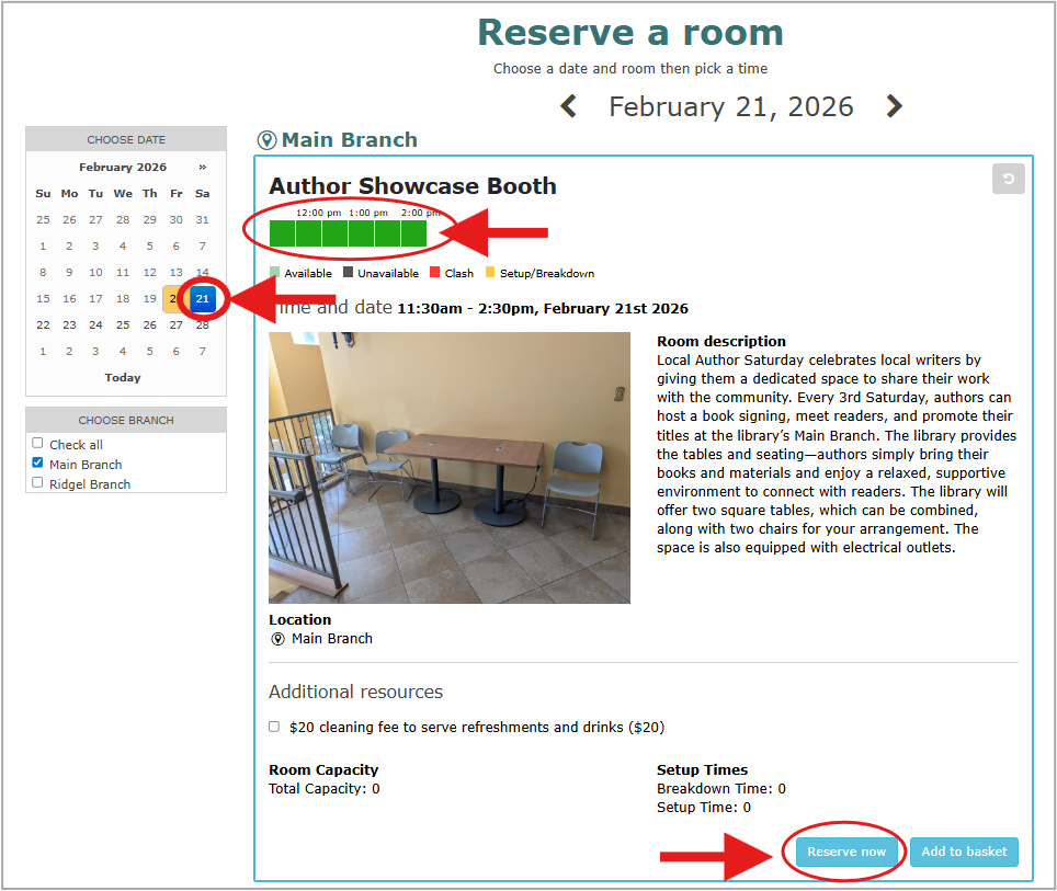 The library will offer two square tables, which can be combined, along with two chairs for your arrangement. The space is also equipped with electrical outlets.